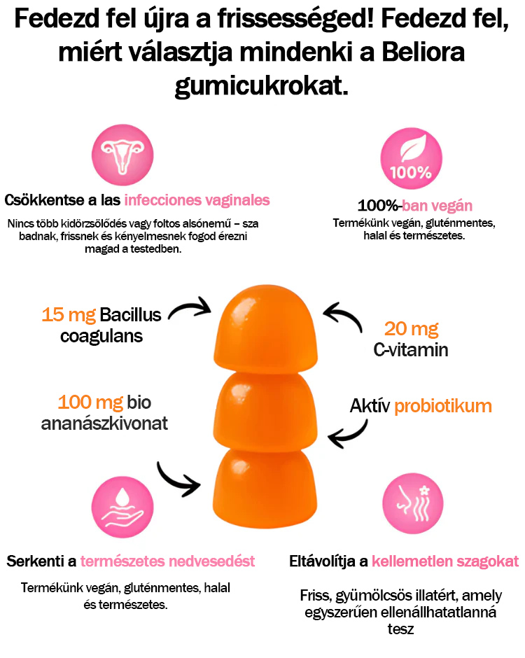 A hüvelyi szag gyakran a megemelkedett pH-értéknek köszönhető, ami megzavarja a mikrobiomot és lehetővé teszi az anaerob baktériumok elszaporodását, különösen menstruáció, nemi aktus vagy antibiotikumos kezelés után. A Beliora célja a savas környezet helyreállítása és a védő laktobacillusok támogatása hőstabil probiotikus törzzsel, célzott C-vitaminnal és bromelainnel, amely elősegíti a belső tisztulást.
