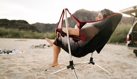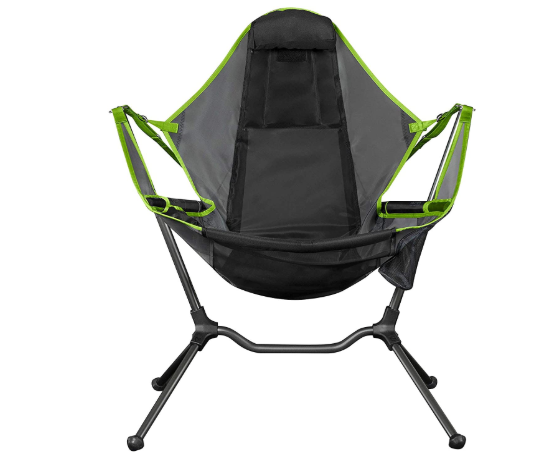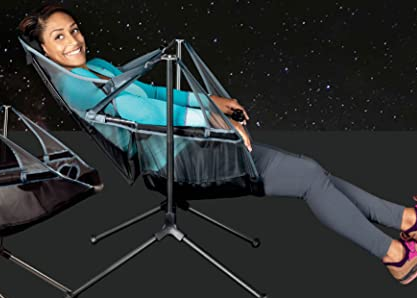 This first-ever swinging and reclining camp chair takes relaxation to a new level. The swinging offers an exciting new sitting experience . with a relaxing motion that is designed for comfort. And when you're ready to recline . lean back and enjoy a great view of the stars. Unlike rocking chairs . this chair is designed for use on any surface . including rocky . sandy or uneven ground . bringing the relaxation of motion to a host of new environments.